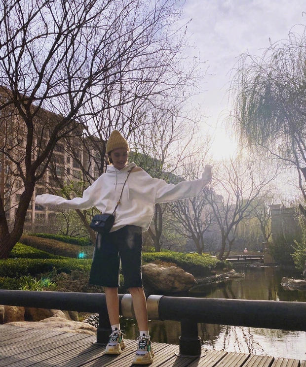 杨丞琳趁北京天气好外出 穿短裤小桥上蹦跶超开心 卫衣小露香肩娇俏可爱